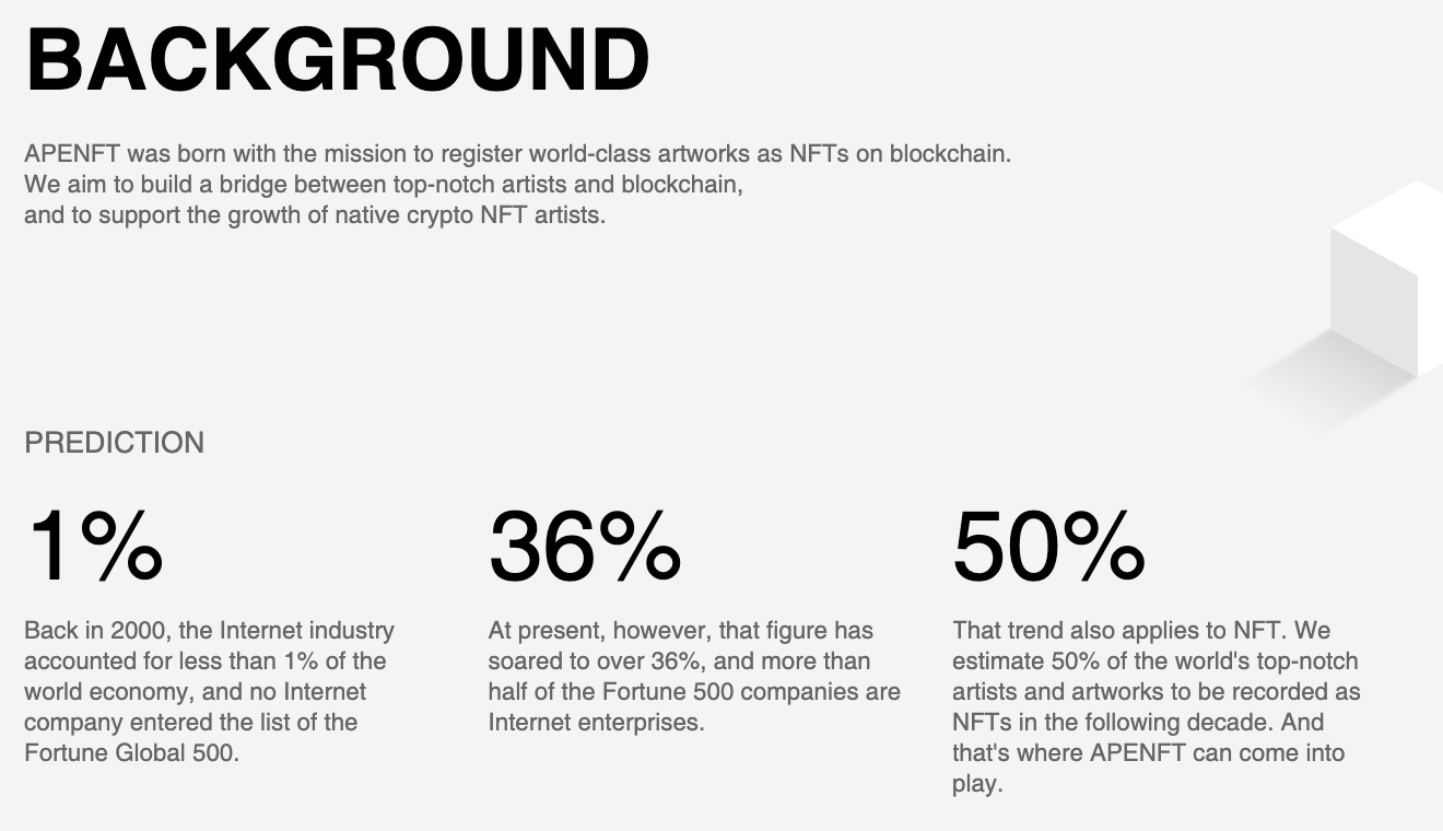 ApeNFT (NFT) - Core businesses of APENFT include: investing in top NFT platforms and artworks, incubating leading NFT artists to build a bridge between world-class artists and the NFT world.