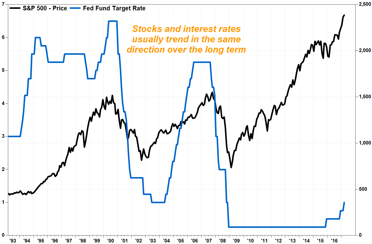The above graph from MarketWatch states that the S&P500 and the interest rates are directly correlated, but the correlation has not been as strong in the past few months. There are always many different variables that influence markets; technology, its rapid advances as well as how fast information travels these days, and how fast we can trade have many implications on market valuations as well as investment decision-making.