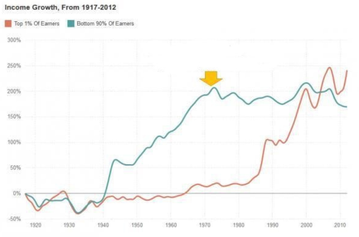 In the above graph we can see how the growth of the worker's salary has remained stagnant since the "Gold Standard" was abandoned while the wealth of the upper class (1% of the United States population) has risen rapidly without a significant slow down.