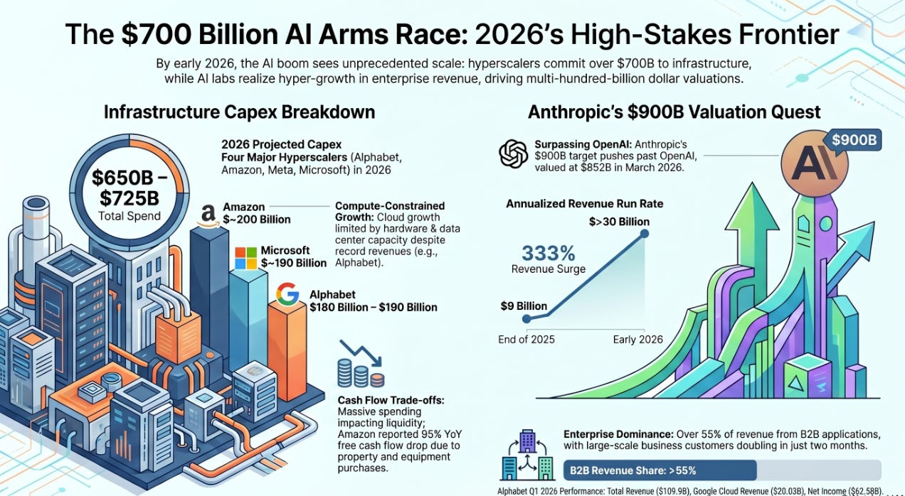 The intersection of Alphabet’s 63% cloud growth, Big Tech’s $700 billion capex commitments, and Anthropic’s push for a $900 billion valuation paints a picture of an industry in the midst of a historic platform shift.