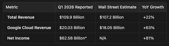 Google's AI Bet Pays Off in a Big Way Cloud Revenue Surges 63% Alphabet blew past Wall Street expectations in Q1 2026, reporting $109.9B in total revenue (up 22% YoY) with Google Cloud alone hitting $20B, a staggering 63% jump driven by AI demand.