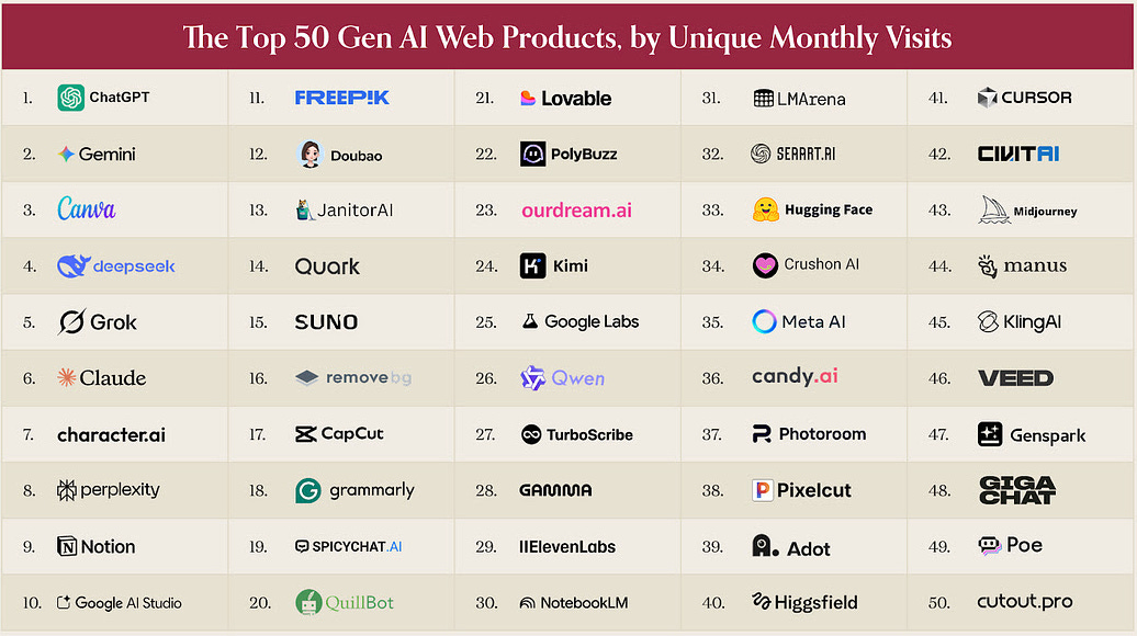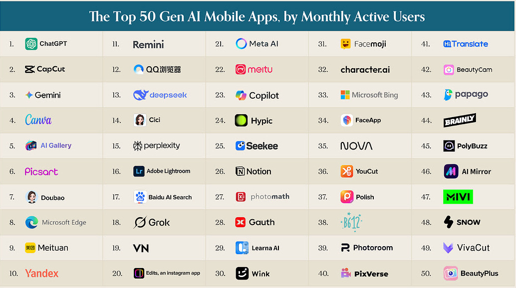 The latest ranking of the top 100 consumer AI apps paints a picture of a maturing market. For the first time, the list now includes mainstream tools like CapCut, Canva, and Notion, where AI has quietly become central to the core experience rather than a bolt-on feature.