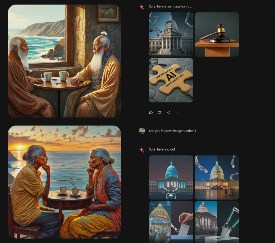 Today, I prompted Google Gemini for images for the AI legislature article below (right image) and another one for “2 old philosopher gurus having coffee and discussing serious matters with the ocean in the background.” I like that it gives you several (3-4) images to choose from or to improve as opposed to ChatGPT which only provides one as output. I also find them more realistic than ChatGPTs when using simple prompts. Check them:
