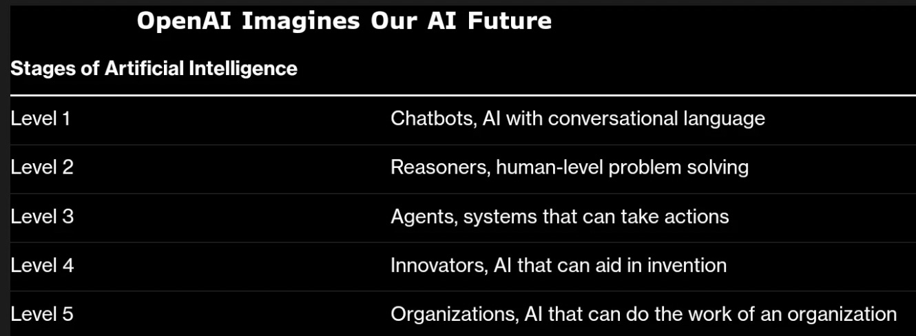 OpenAI has introduced a five-level system to track its progress towards achieving human-level artificial general intelligence (AGI). Currently, OpenAI is at the first level, which involves conversational AI. The company is nearing the second level, termed "Reasoners," where AI can perform basic problem-solving akin to a human with a PhD but without tools. The third level, "Agents," involves AI performing tasks over several days, while the fourth level, "Innovators," describes AI aiding in new inventions. This system, designed by OpenAI executives, will evolve with employee, investor, and board feedback. Recently, OpenAI integrated its “Superalignment” team’s responsibilities into other research efforts.