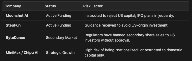 Beijing has moved to insulate its “national champions” in the AI sector from American influence. Regulators have reportedly issued direct guidance to several top-tier AI startups to reject US capital in future funding rounds.