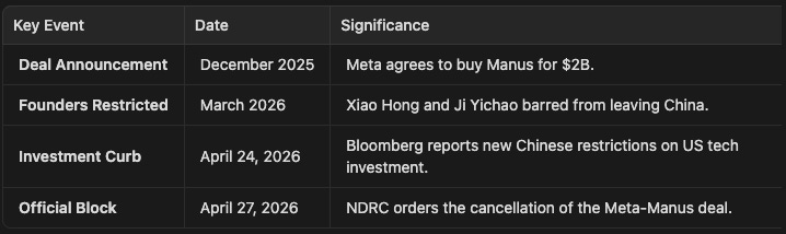 I was honestly very surprised when I heard the news that Meta was buying Manus for $2B in December of 2024. I had and have been using Manus for quite a while now, and find the model very powerful and better than some of the US rivals. SO this news seemed to me great for Meta, which I am not a fan of, and Manus investors looking to cash out, but detrimental for Manus the Model. The decision by China’s National Development and Reform Commission (NDRC) to block Meta Platforms Inc.’s $2 billion acquisition of the agentic AI startup Manus marks a watershed moment in the escalating technological rivalry between Washington and Beijing. This move, announced on April 27, 2026, represents a significant escalation in China’s efforts to prevent the “leakage” of critical artificial intelligence technology to the United States. While the deal was initially seen as a successful exit for a startup with global aspirations, it has now become a cautionary tale for the “dual-exit” risks facing Chinese-founded tech firms.