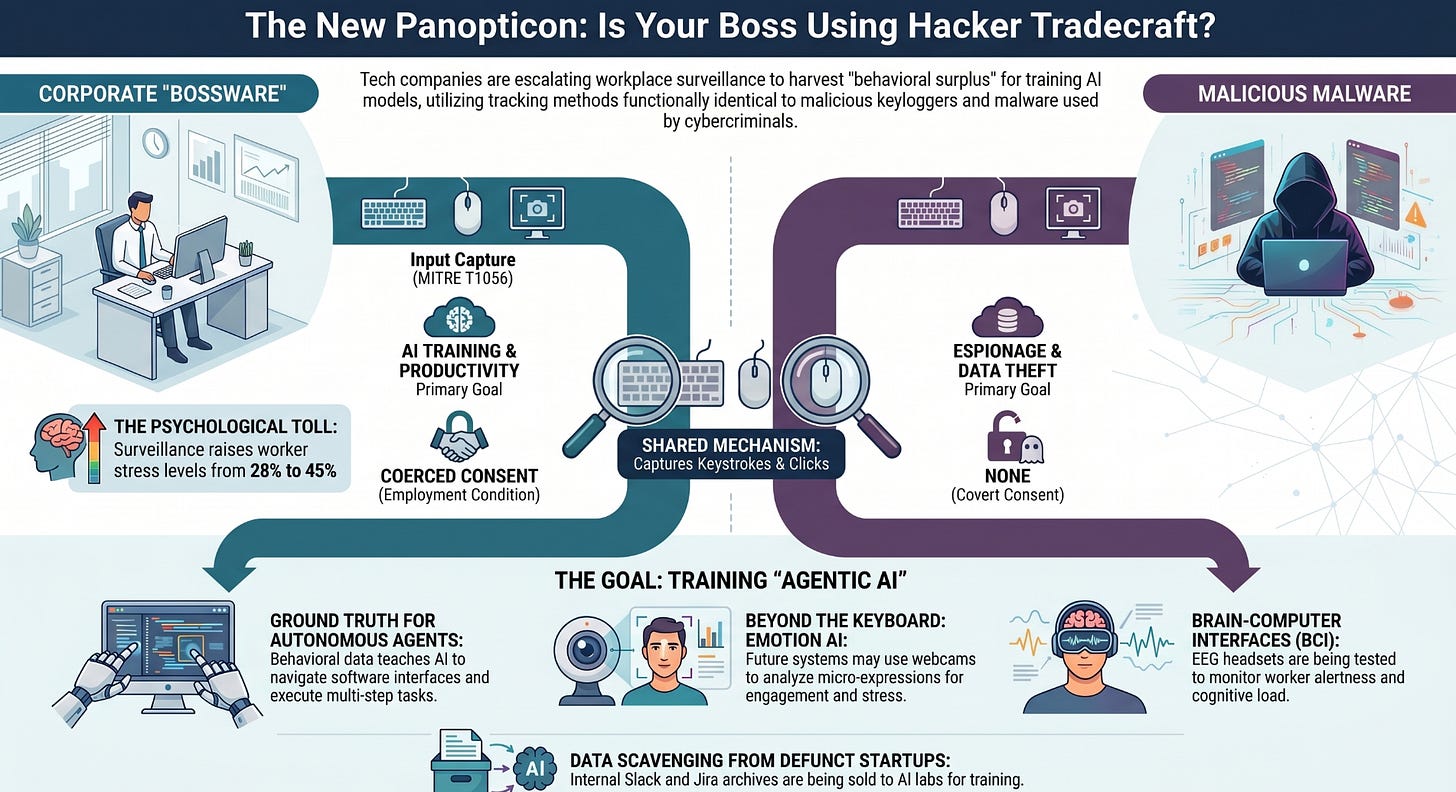 Metaâs decision to track employee keystrokes and mouse movements for AI training is a watershed moment in corporate surveillance. It perfectly illustrates the mechanics of surveillance capitalism applied to the workforce, utilizing techniques indistinguishable from malicious hacker tradecraft to extract behavioral surplus. As the AI industryâs hunger for data drives the commodification of every digital interactionâfrom the Slack messages of dead startups to the micro-movements of current employeesâthe fundamental right to privacy in the workplace is being systematically dismantled. Without robust regulatory intervention and a reassertion of digital labor rights, the future of work risks resembling the totalizing surveillance of 1984, optimized not just for control, but for the automated replacement of the workers themselves.