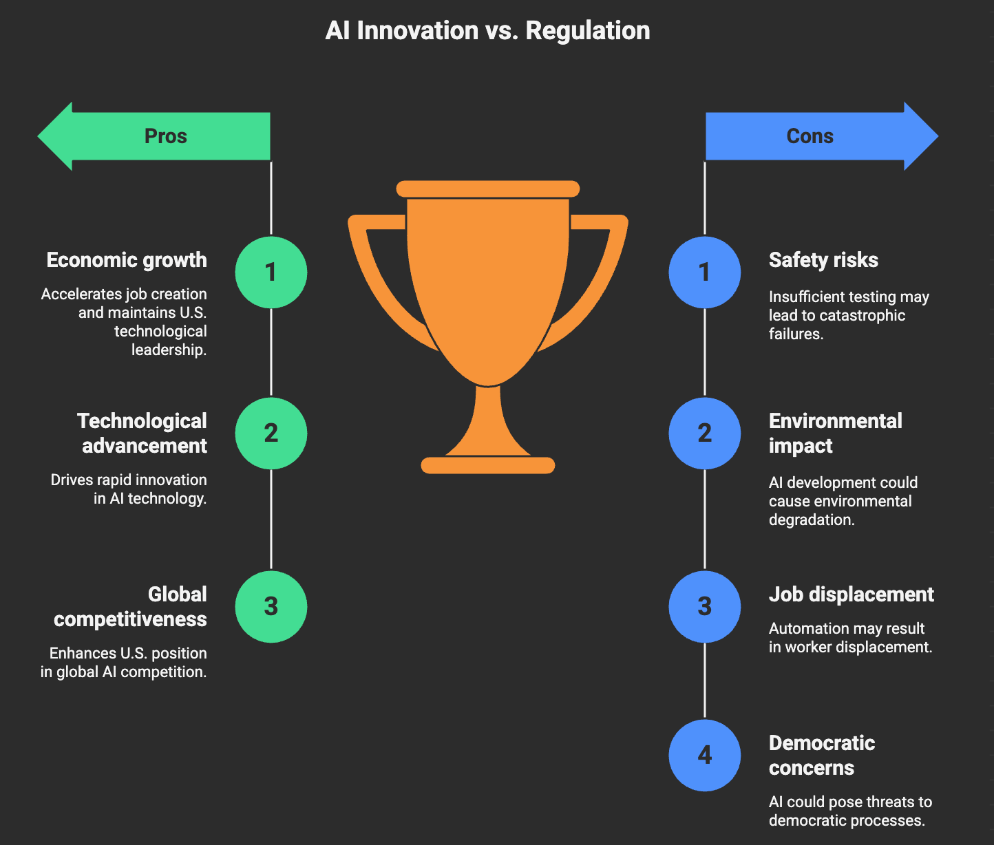 This action plan sounds good on paper, but what are the cons? America's AI Action Plan represents a dramatic shift from safety-first to competition-first AI policy, prioritizing rapid development and global dominance over cautious regulation. While this approach could accelerate innovation, create jobs, boost economic growth, and maintain U.S. technological leadership against rivals like China, it also carries significant risks, including insufficient safety testing, environmental degradation from massive energy demands, worker displacement, and democratic concerns about concentrated AI power.