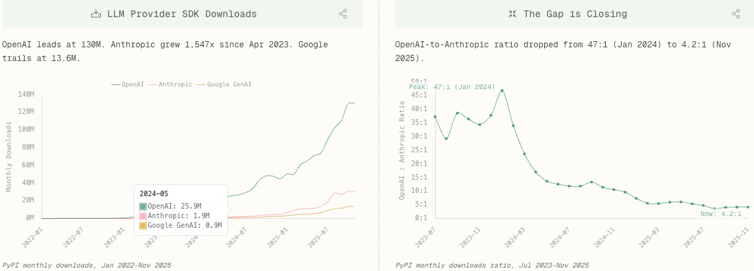 The Gap is Gone: In Jan 2024, the ratio of OpenAI-to-Anthropic SDK downloads was 47:1. As of Nov 2025, it is just 4.2:1.